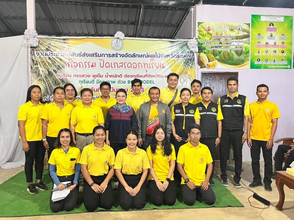 วันพุธที่ 5 มีนาคม 2568 นางเพ็ญประภา จันทร์คง เกษตรจังหวัดระนอง พร้อมด้วยเจ้าหน้าที่สำนักงานเกษตรจังหวัดระนอง ร่วมกับนางศิริทิพย์ แก้วกระจ่าง เกษตรอำเภอกระบุรี และเจ้าหน้าที่สำนักงานเกษตรอำเภอกระบุรี ร่วมจัดงานประชาสัมพันธ์ส่งเสริมการสร้างอัตลักษณ์ผลไม้จังหวัดระนองปี 2568 กิจกรรม ปัดเกสรทุเรียน ฝนแปด แดดสี่ ทุเรียนดี มีคุณภาพ ด้วย BCG MODEL ทรงสวย พูเต็ม น้ำหนักดี ต้องทุเรียนที่จังหวัดระนอง ณ ที่ทำการแปลงใหญ่ หมู่ 9 ตำบลจ.ป.ร. อำเภอกระบุรี จังหวัดระนอง